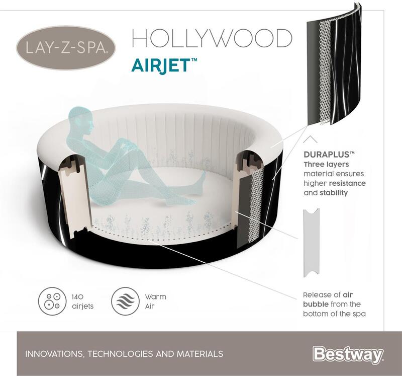 Po dlhom dni nie je nič príjemnejšie, než sa ponoriť do teplej, bublajúcej vody priamo na vašej záhrade. Lay-Z-Spa® Hollywood AirJet™ poskytuje upokojujúci masážny zážitok až pre 6 osôb a pritom sa rýchlo a ľahko nastavuje. Jednoducho pripojte technologickú jednotku a sledujte, ako sa nafúkne.